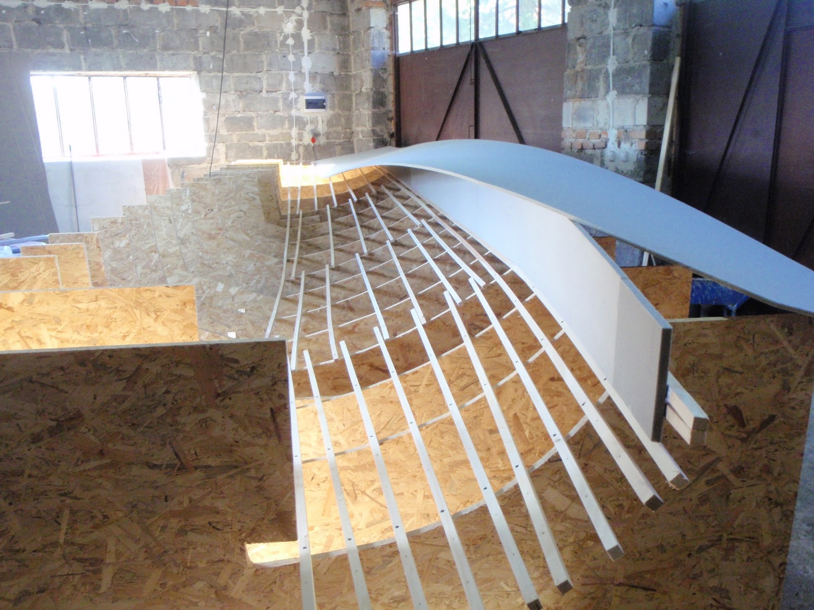 Sosnowe listwy dokręcone do formy. Całość daje kształt dna i burty. Oj, trzeba zamawiać tkaninę szklaną. U góry formy , po prawej widać dokręcony już płat denny a na nim leży przygotowany cały płat burtowy.
